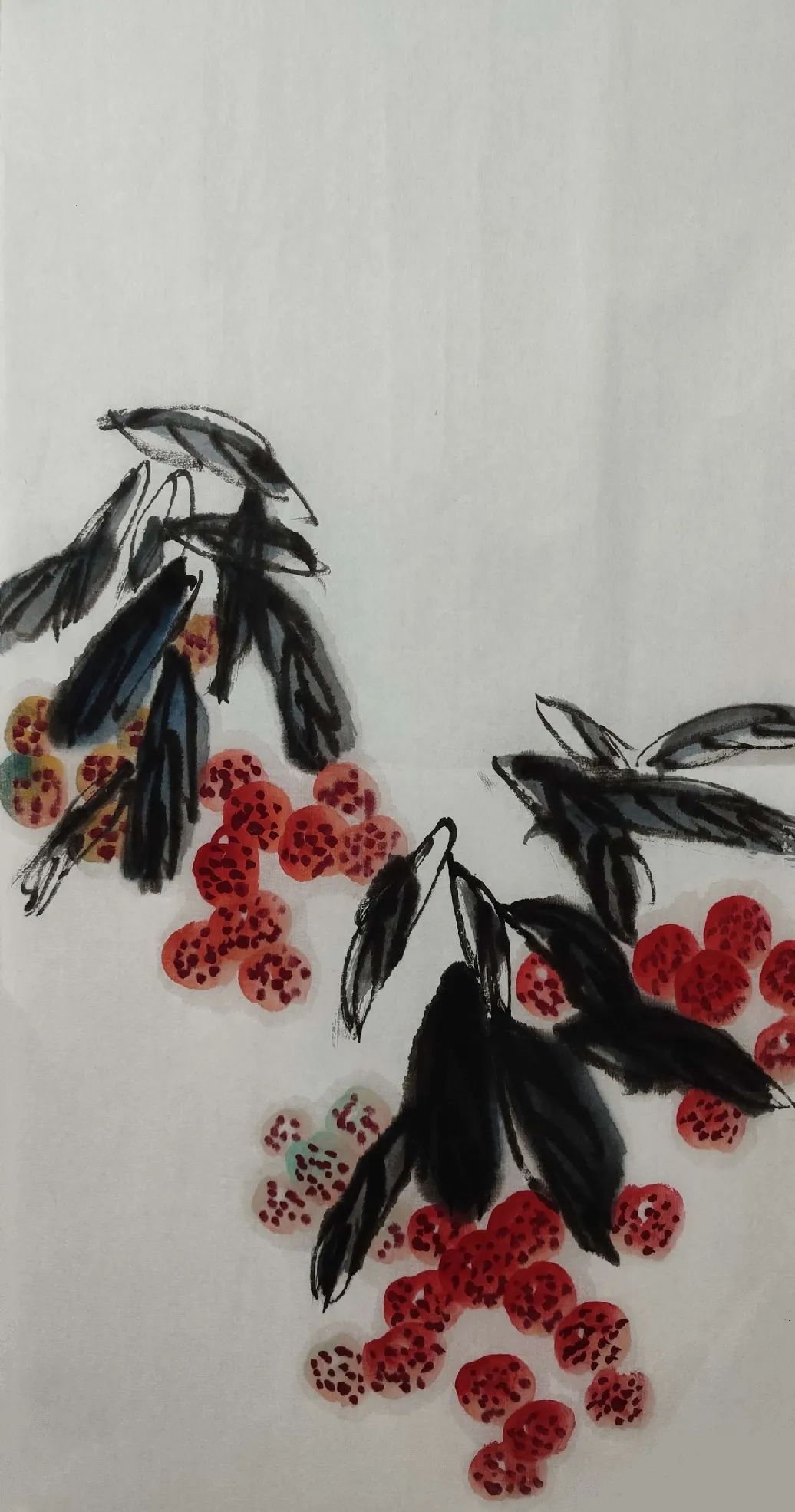 荔枝属常绿乔木,果皮有鳞斑状突起,鲜红,紫红。成熟时至鲜红色;种子全部被肉质假种皮包裹。花期春季,果期夏季。荔枝谐音“利枝”,因此有福利满枝头之说,是很吉祥的国画题材。